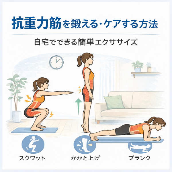 抗重力筋を鍛えるには、特別な器具がなくても始められる方法があると言われています。例えばスクワットは大臀筋や大腿四頭筋を刺激しやすい運動として紹介されています。