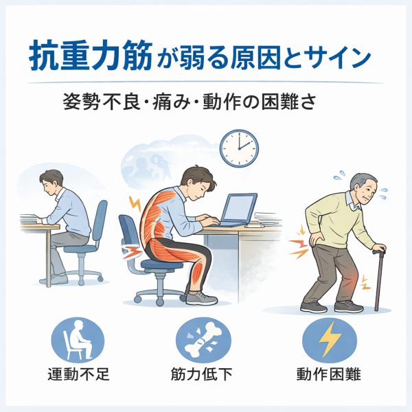 抗重力筋が弱る原因とサイン|姿勢不良・痛み・動作の困難さ