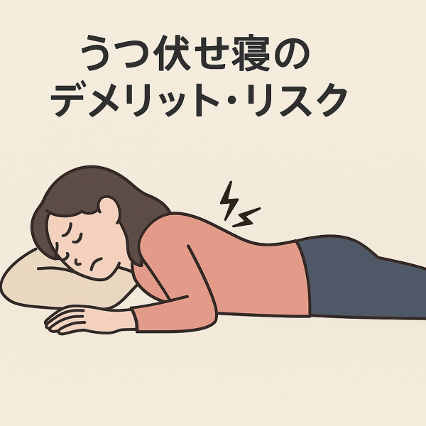 また、仰向けや横向きと比べると、背骨の自然なS字カーブが保ちづらく、腰が反った状態(“反り腰”)になりやすいとの指摘があります。