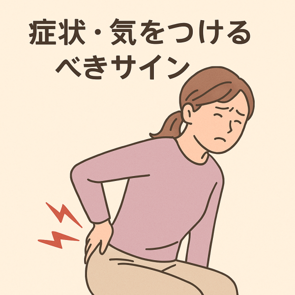- 腫れ、圧痛、動作時の違和感、排便時の痛みや便秘のおそれ