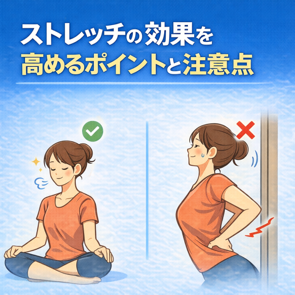 ストレッチ中に呼吸が止まると、体に力が入りやすくなり、筋肉が緩みにくくなると言われています。ゆっくり息を吐きながら行うことで、自然と力が抜けやすくなると考えられています。