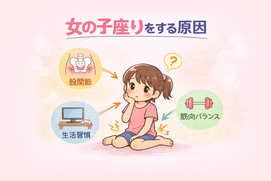 もうひとつの要因として、筋肉バランスの偏りが挙げられています。股関節を外に開く筋肉が弱く、内側にねじる筋肉が優位になると、女の子座りが取りやすくなる傾向があると言われています。