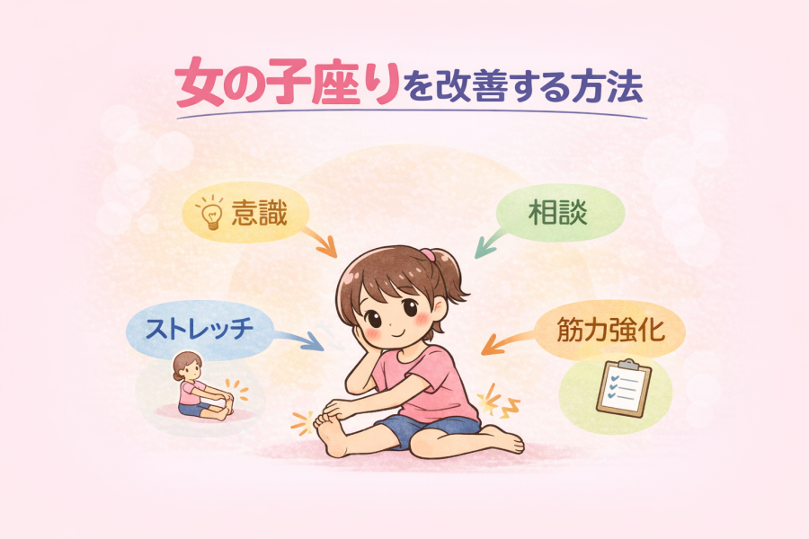 「女の子座りってどうやって改善すればいいですか?」とよく聞かれます。大切なのは、無理にやめさせることではなく、体の使い方を少しずつ整えていくことだと言われています。股関節の向きや筋肉のバランスを見直すことで、姿勢の偏りが軽減される可能性があると紹介されています。ここでは、日常の意識・ストレッチ・筋力強化・相談の目安に分けて整理します。