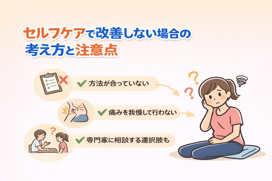 セルフケアで変化を感じにくいケースとして、長年の姿勢のクセが定着している場合や、腰・股関節の動きに左右差がある場合が挙げられるようです。また、「毎日頑張っているのに余計につらい」と感じる場合は、体の状態に合っていない可能性も考えられています。努力不足ではなく、方法が合っていないだけ、という見方も必要かもしれません。