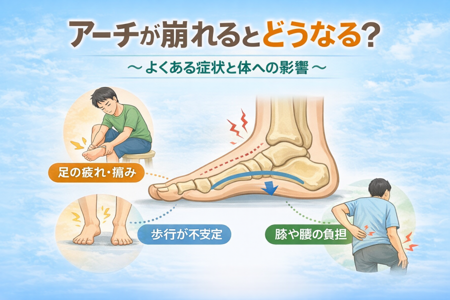 アーチがうまく機能しないと、地面を踏みしめる感覚が不安定になり、歩行時に違和感を覚えることがあるようです。つまずきやすさや疲労感につながるケースもあると言われています。
