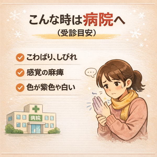「しばらく温めたら戻るから大丈夫かな?」と様子を見る方も多いですが、頻繁に繰り返したり、左右差がはっきりしていたりする場合は、一度専門家に相談する考え方も大切だと言われています。特に、日常生活に支障が出るほどの違和感が続く場合は、無理をせず来院の目安として捉えると安心です。