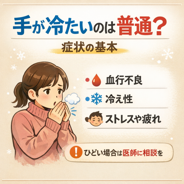頻繁に手が冷たい状態が続いたり、色の変化やしびれを伴う場合、体の別の状態が影響している可能性もあると言われています。たとえば、血管が一時的に強く収縮するレイノー現象や、甲状腺の働きの変化などが関係するケースも紹介されています。