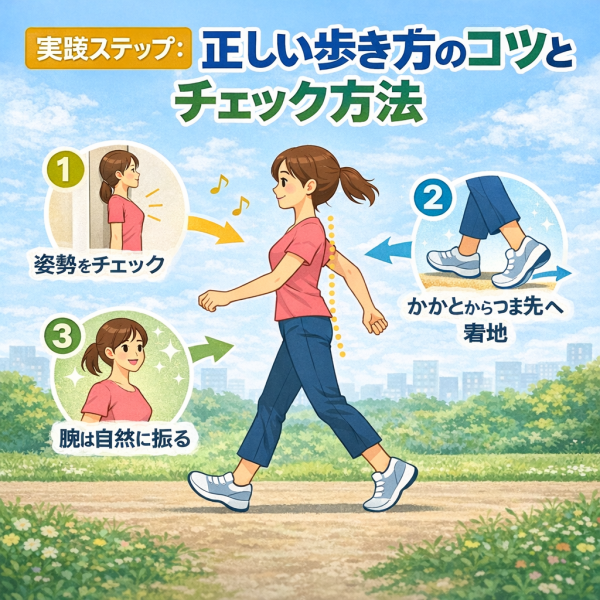 歩き始めたら、かかとから静かに接地し、足裏全体で体重を受け止めます。その後、自然につま先へ体重が移動する流れを意識します。腕は前後に軽く振り、肩に力が入りすぎないよう注意すると良いとされています。