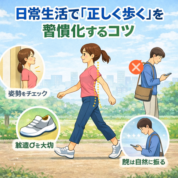 「駅までの道だけ」「自宅からコンビニまで」など、意識する区間を決めると継続しやすくなります。最初から完璧を目指さず、気づいたときに姿勢を整えるだけでも十分だと考えられています。