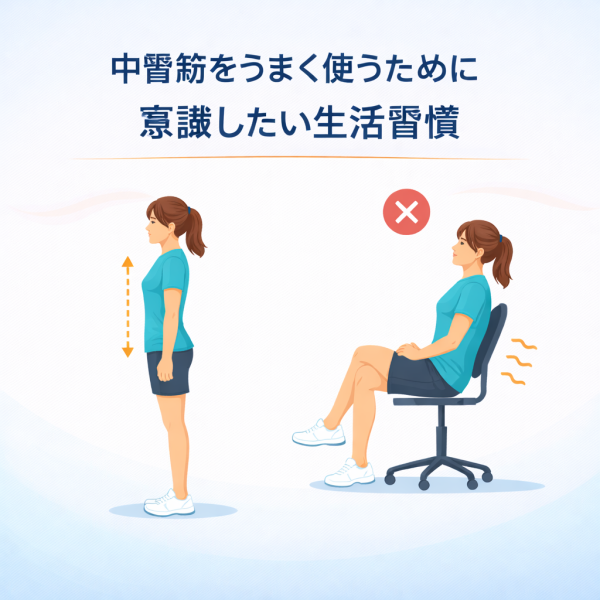 座っている時間が長いと、中臀筋は使われにくくなります。こまめに立ち上がる、軽く動くなどの工夫が大切です。特にデスクワーク中心の方は意識しておきたいポイントです。