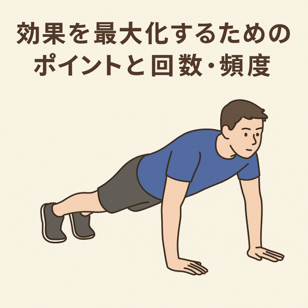 目安としては10回×2〜3セットを週に2〜3回程度。膝つきやインクライン(手を高くして行う)など負荷を下げた方法でフォームを固めるのがおすすめです。