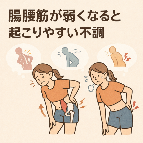 こうした違和感と腸腰筋の使われ方には、関係がある場合もあると言われています。腸腰筋がうまく働かないと、周囲の筋肉が代わりに頑張りすぎてしまい、腰やお尻、股関節まわりに負担が出やすくなることがあるようです。