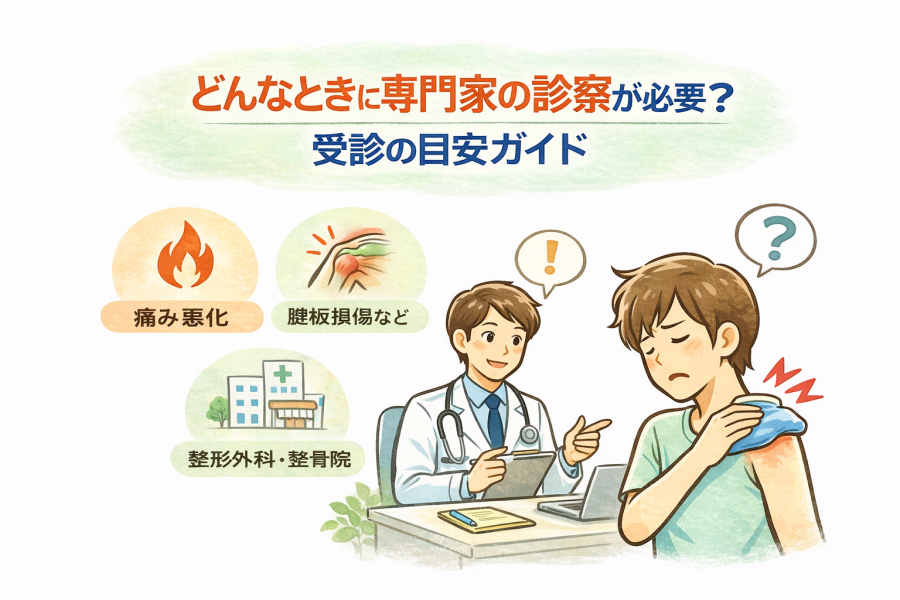 たとえば、「痛みの範囲が広がってきた」「動かせる角度がどんどん減っている」「数日たっても変化がない」と感じたときです。会話で言うなら、「前より動かしづらくない?」と自分に聞いてみる感覚ですね。