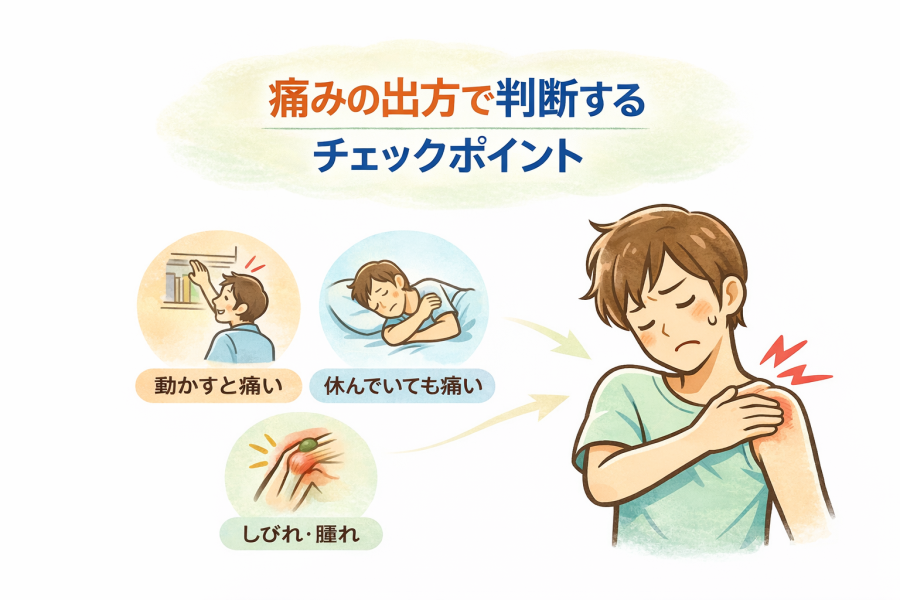 「腕を上げたときに付け根がズキッとする」「動かすと違和感が出るけど、これって筋肉痛?」