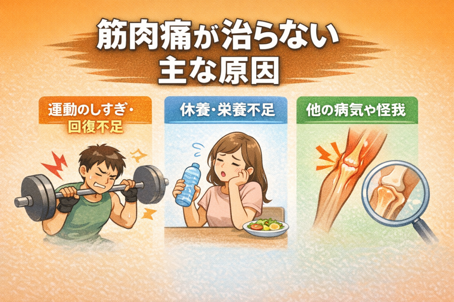 そんなときに考えられるのが、筋肉への負荷が強すぎたケースです。無理なトレーニングや慣れない動きを続けると、筋繊維の修復が追いつかず、筋肉痛が長引きやすいと言われています。
