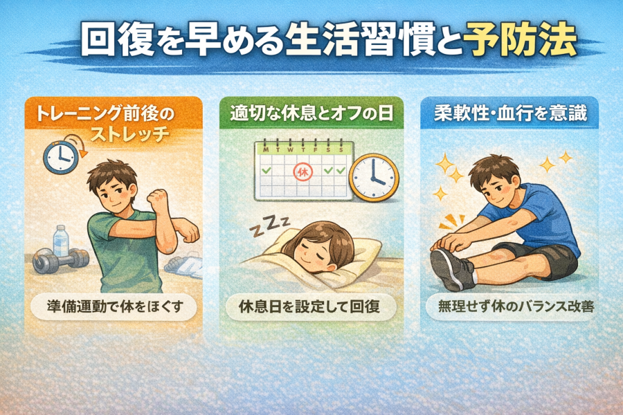 筋肉の回復には、タンパク質やビタミン、水分補給が関係していると言われています。また、睡眠中に体が整いやすいとも考えられているため、夜更かしが続くと回復が遅れやすい場合もあるようです。