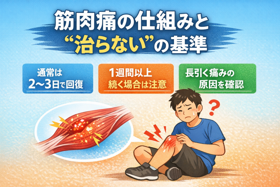 そう感じたら、まず期間に目を向けてみてください。一般的な筋肉痛は数日〜1週間ほどで落ち着くことが多いと言われています。一方で、1週間以上たっても痛みや違和感がほとんど変わらない場合は、単なる筋肉痛ではない可能性も考えられるようです。