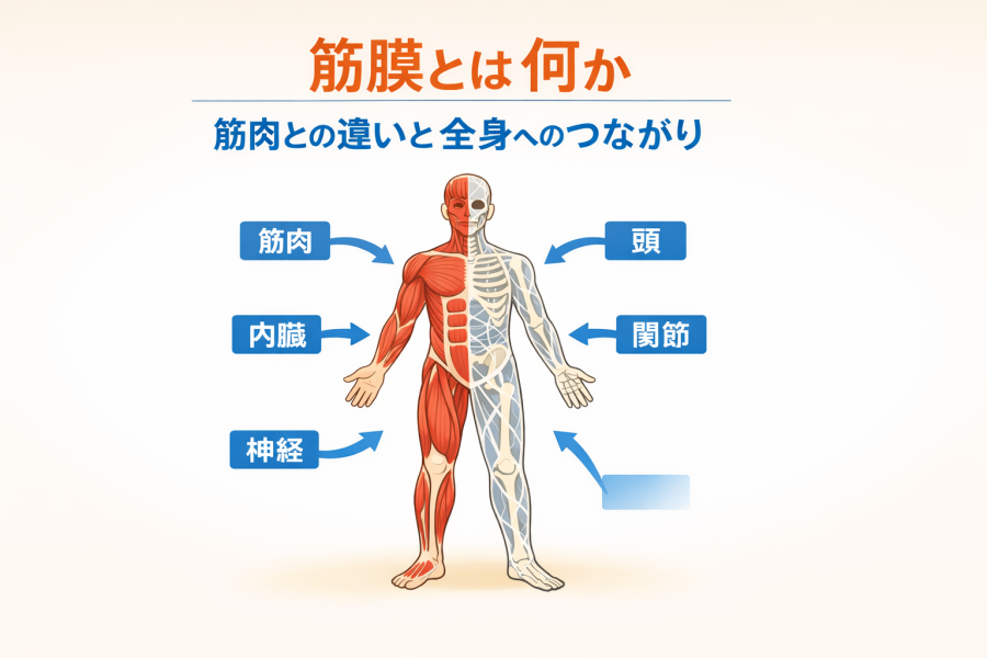 筋膜とは、筋肉だけでなく骨や内臓、血管、神経などを包み込む薄い膜状の組織のことを指します。筋肉を一つひとつ独立して動かすというより、全身を一枚のボディスーツのようにつないで支える役割があると言われています。そのため、特定の部位だけでなく、体全体のバランスや動きに関与している点が特徴です。