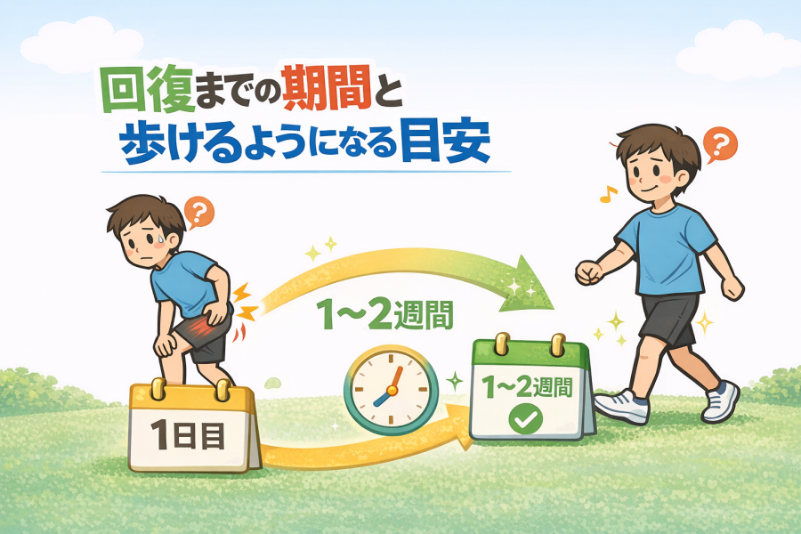 「もう歩けるから治ったと思っていいですか?」と聞かれることもありますが、歩行できる状態と筋肉の負担が完全に落ち着いた状態は必ずしも同じではないと考えられています。痛みが軽くなっても、筋線維の修復が途中段階の場合もあるため、違和感が残る期間が続くこともあると言われています。
