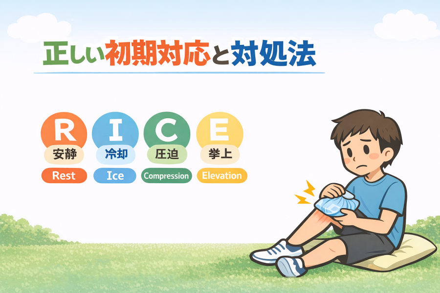 Rは安静、Iは冷却、Cは圧迫、Eは挙上のことです。「今は動けるから平気」と思って動き続けるより、まずは負担を減らす意識が大切だと考えられています。