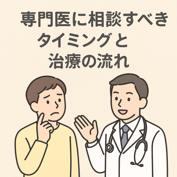 など。これらが当てはまる場合は、自己判断で無理せず専門機関に来院することが推奨されていると言われています(引用元:https://www.krm0730.net/blog/3005/)。一人で抱え込んでしまうと、対処が遅れてしまい不安が増えることもあるため、不安な症状があるときは早めに相談した方が安心だとされています。