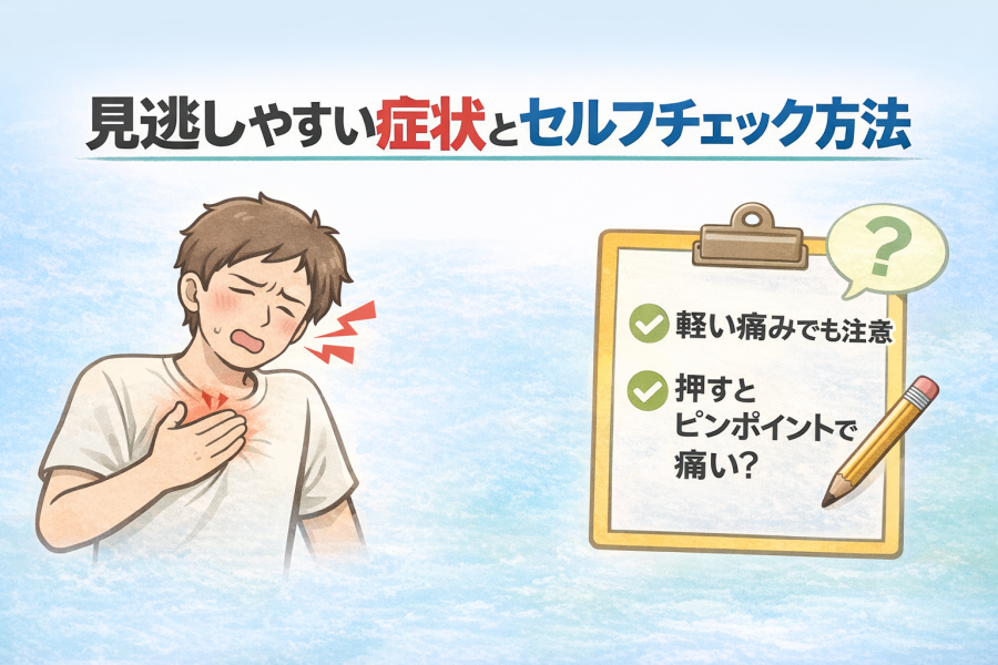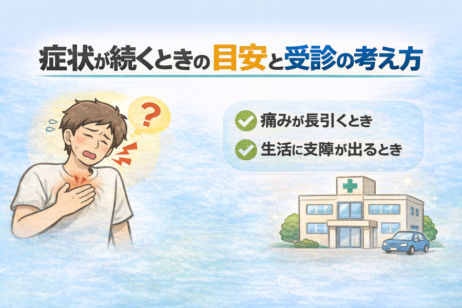 また、深呼吸や咳のたびに強い痛みが続く場合や、日常動作にも影響が出ているときは、一度体の状態を確認することが大切と考えられています。