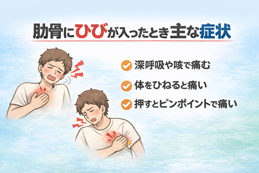 「ただの筋肉痛かな?」と思っていたら、深呼吸や咳をした瞬間にズキッと痛む…こういったケースは注意が必要と言われています。肋骨にひびが入ると、呼吸に合わせて胸郭が動くたびに刺激が加わるため、特に息を大きく吸ったときや咳・くしゃみで痛みが出やすいのが特徴です。