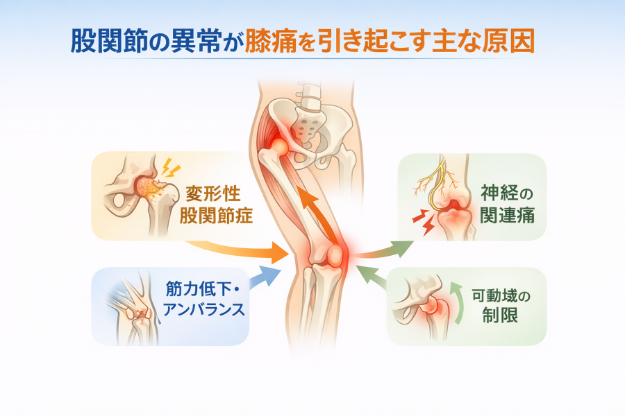 股関節に異常がある場合でも、痛みを感じる場所が膝になることがあると言われています。これは神経の走行や脳での痛みの認識が関係しており、「関連痛」と呼ばれる現象の一つとされています。そのため、膝だけを見ていると原因がはっきりしないケースも少なくありません。