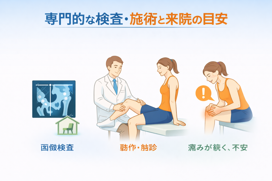 痛みが長期間続く場合や、歩行がしづらい、動かすたびに不安があるといった状態が見られる場合は、専門家へ相談する選択肢もあると言われています。体の使い方や関節の状態を総合的に確認することで、今後のケアの方向性が見えやすくなることもあるようです。