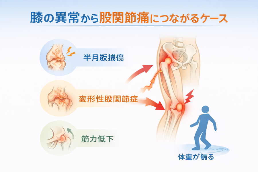 膝の異常が長引くと、姿勢全体や重心位置にも変化が出やすくなります。骨盤の傾きや左右差が大きくなることで、股関節の動きが制限され、違和感や張り感につながるケースも報告されています。膝と股関節は「どちらが原因か」を切り分けて考える視点が大切と言われています。