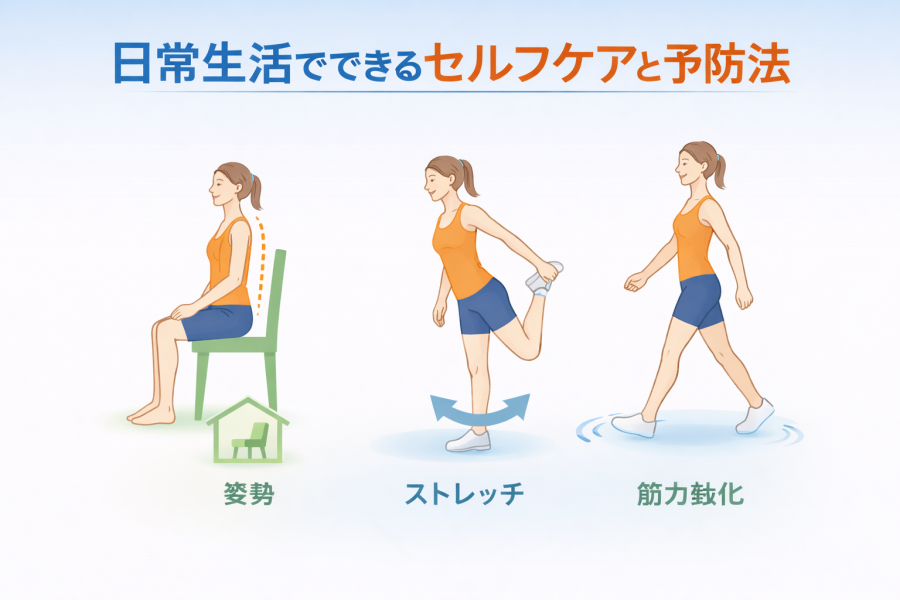 股関節周囲や太もも、お尻の筋肉をやさしく動かすストレッチは、可動域を保つための一つの方法とされています。また、体幹を含めた筋力バランスを整えることで、膝や股関節への偏った負担を減らせる可能性があると言われています。無理のない範囲で継続することがポイントです。
