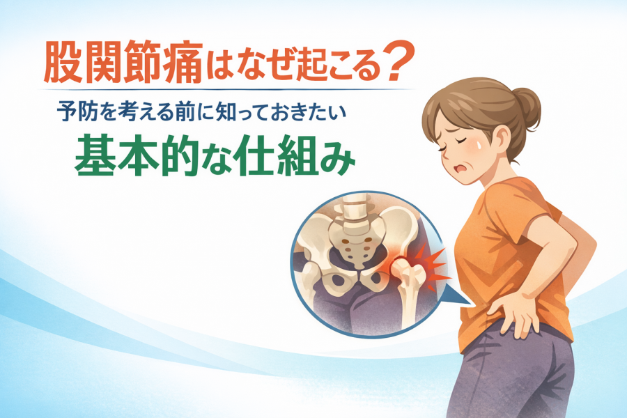 股関節痛は加齢と結びつけて考えられがちですが、実際には生活習慣や体の使い方が影響している場合も多いとされています。年齢だけで判断せず、「なぜ負担がかかっているのか」という視点で体を見直すことが、予防を考える第一歩になると言えそうです。