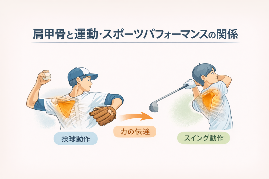 スポーツ動作では、地面からの力が体幹を通り、腕へ伝わる流れが重要だと言われています。この流れの中で、肩甲骨は力を伝える中継点の役割を担います。投球やスイング動作で肩甲骨がうまく動くと、力を効率的に使いやすくなると考えられています。
