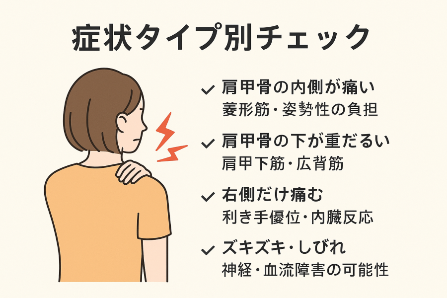- 肩甲骨の内側が痛い → 菱形筋・姿勢性の負担