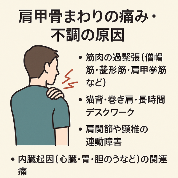 - 筋肉の過緊張(僧帽筋・菱形筋・肩甲挙筋など)
