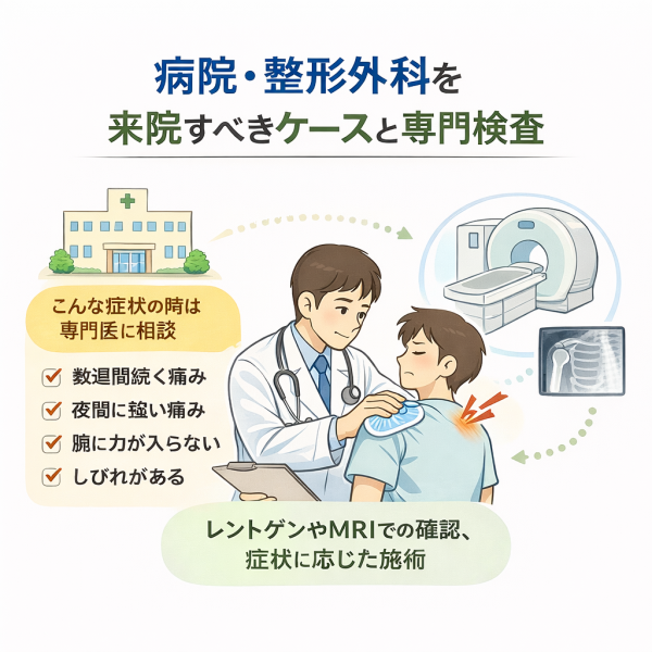 肩の痛みが長引く場合、自己ケアだけでは改善しづらいケースもあると言われています。次のような症状がある場合は、専門家に相談することがすすめられています。