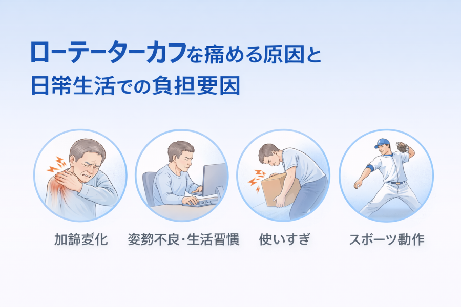 長時間のデスクワーク、スマホ姿勢、片側だけで荷物を持つ癖などは、肩のバランスを崩す要因になります。無意識の習慣が、ローテーターカフに負担をかけていることも少なくありません。