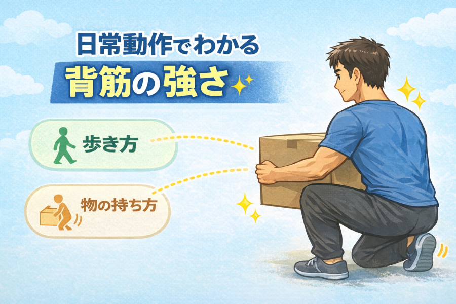 実は、筋肉の見た目よりも日常のちょっとした動作に、その違いが表れやすいと言われています。背筋が強い人は、特別な動きをしていなくても、立つ・歩く・持つといった基本動作が安定しやすい傾向があるようです。