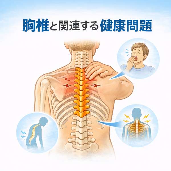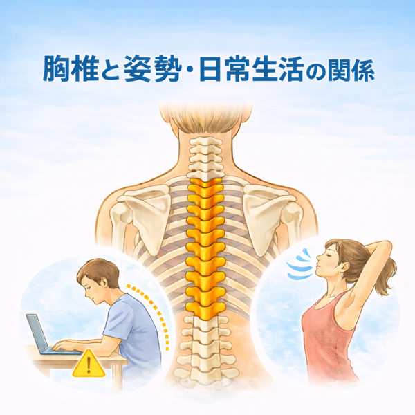 また、胸椎は肋骨とつながっているため、動きが悪くなると胸まわりの張りや呼吸のしづらさを感じる人もいるようです。こうした症状が続く場合は、胸椎そのものだけでなく、姿勢や生活習慣も関係していると考えられています。