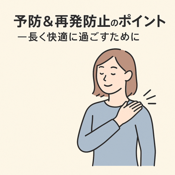 また、肩甲骨まわりのストレッチや呼吸を意識したエクササイズも有効とされ、筋肉の柔軟性と安定性を高めることで、再発予防にもつながると言われています。