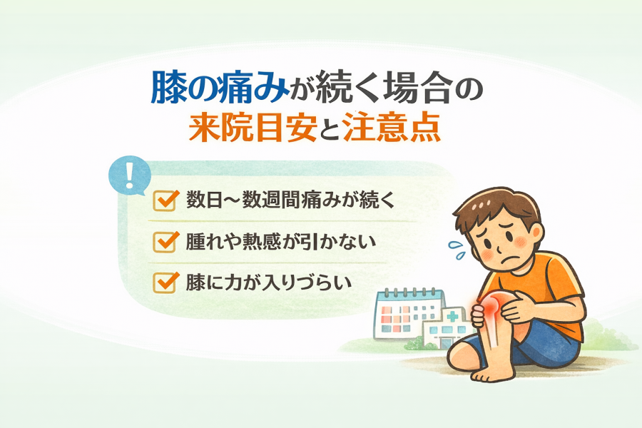 一方で、「動き始めに毎回痛む」「腫れや熱っぽさが続く」「膝が不安定な感じがする」といった状態が続く場合は注意が必要です。体の内側で何らかの変化が起きている可能性も考えられるため、早めに専門家に相談する目安になると言われています。