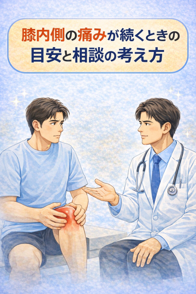 一般的に、膝内側の痛みが数日〜数週間続く場合や、動くたびに痛みが出る状態が続く場合は、体の状態を確認したほうがよいと言われています。