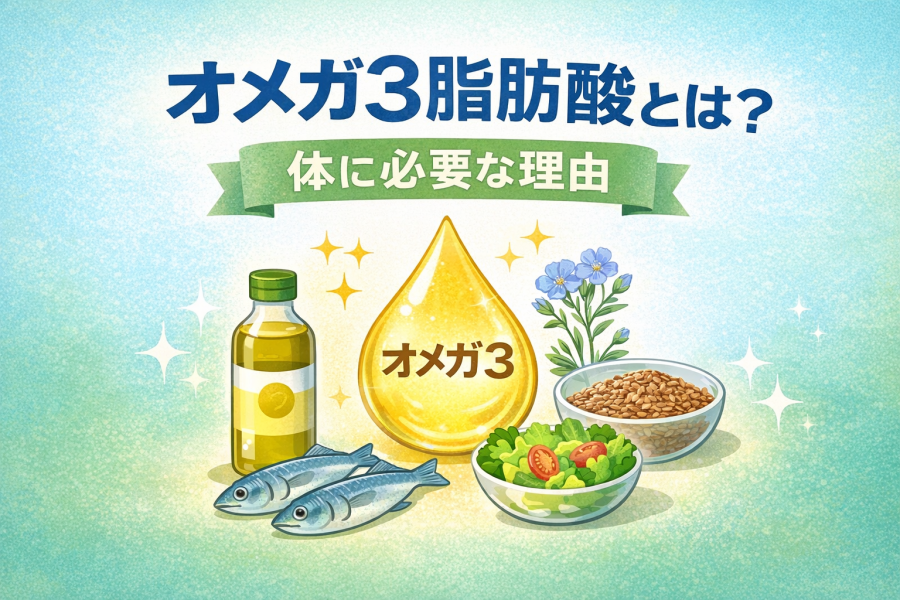 オメガ3脂肪酸とは、えごま油・亜麻仁油・青魚などに多く含まれる脂肪酸の一種です。