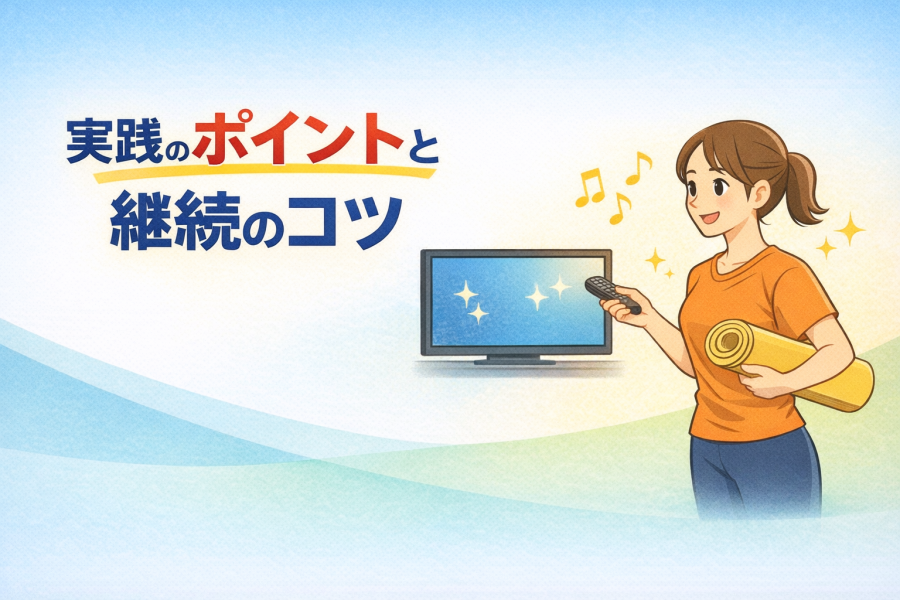 いきなり完璧を目指すと、続きづらくなることがあります。そのため、最初は回数を減らす、動作を浅くするなど、ハードルを下げて始める方法がよいと言われています。また、テレビを見ながら行うなど、日常動作と組み合わせる工夫も紹介されていました。