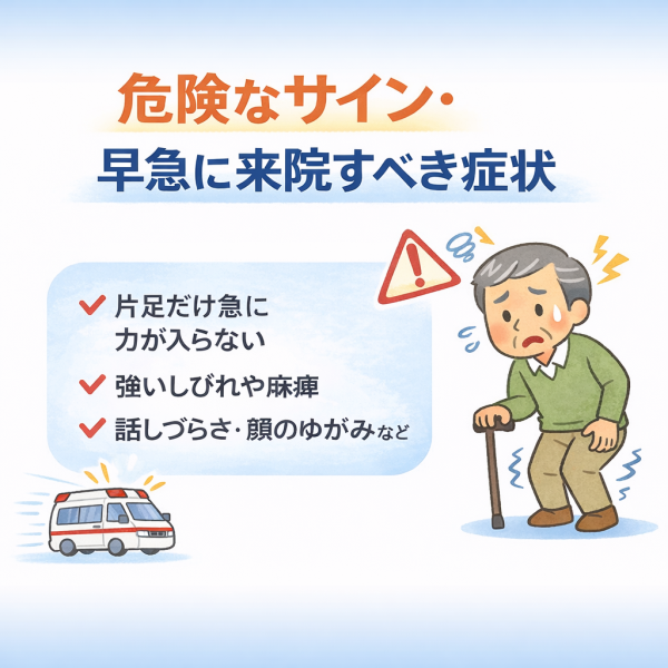 こんな場面、実は少なくありません。急な変化、とくに片足だけの脱力や、しびれ・話しづらさなどが同時に出る場合は、神経や脳の影響が関係している可能性があると言われています。様子見で落ち着くこともありますが、急激な変化は判断を先延ばしにしない方がよいケースが紹介されています。