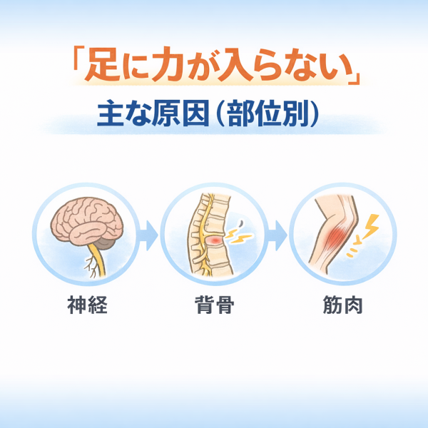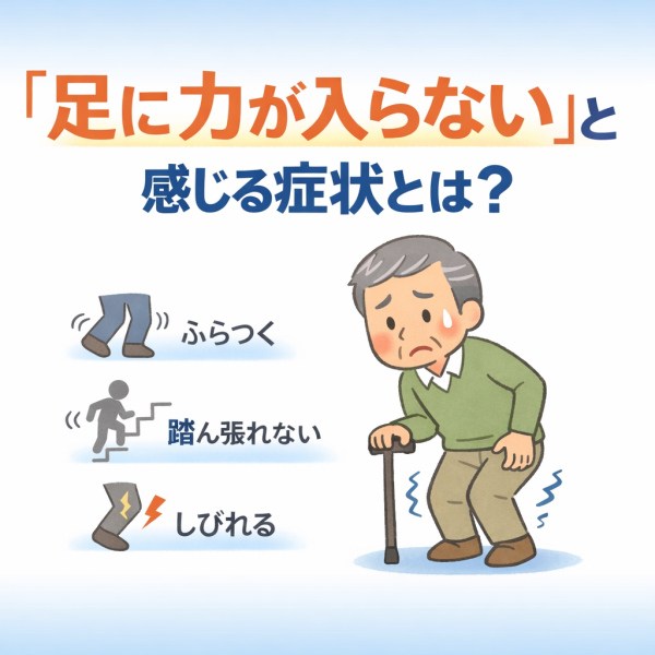 たとえば、ある日突然、片足だけ力が入りにくくなった場合、神経系の影響が疑われることがあるそうです。一方で、両足とも徐々に力が入りづらくなってきた場合は、背骨まわりや筋力低下が関係しているケースも見られます。