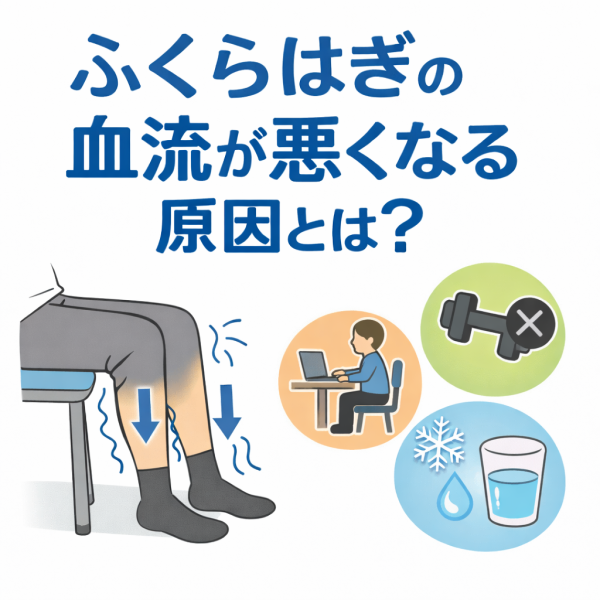 ふくらはぎの血流が悪くなる背景には、いくつかの生活習慣が関係すると言われています。代表的なのは長時間の座り姿勢です。座ったまま足を動かさない状態が続くと、筋肉ポンプの働きが弱くなり、血液が循環しづらくなるとされています。また、運動不足も影響すると考えられています。歩く機会が少ない生活では、ふくらはぎの筋肉を使う頻度が減るため、血液を押し上げる力が弱まりやすいと言われています。さらに、冷えや水分不足なども血液循環に関係するとされ、体が冷えると血管が収縮し、血流がスムーズに流れにくくなる可能性があるとされています。こうした要因が重なることで、むくみや足のだるさを感じる人も少なくないと言われています。