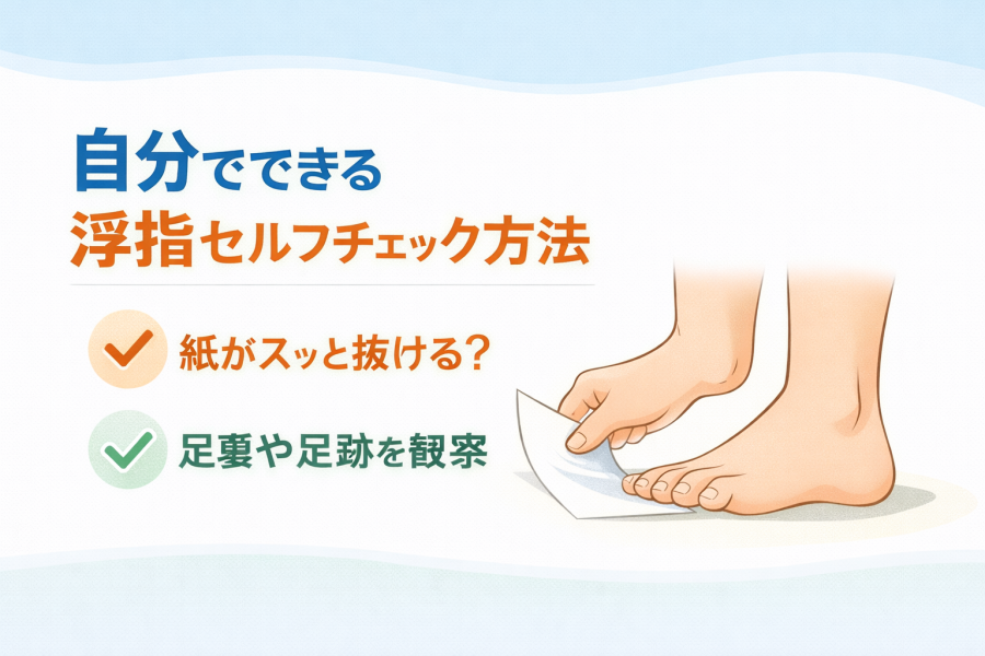 浮指かどうかは、専門的な機器がなくても、自宅である程度確認できると言われています。たとえば、床に立った状態で足指の下に紙を差し込み、簡単に抜けてしまうかどうかを見る方法があります。また、足裏の汚れ方や床に残る足跡を確認することで、指が接地しているかを判断する方法も知られています。