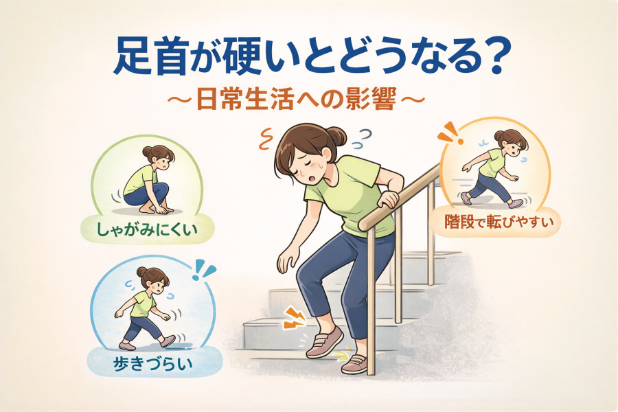 足首は歩く・立つ・しゃがむなど、毎日の動きで常に使われています。そのため、多少の硬さがあっても自覚しづらく、「年齢のせい」「疲れているだけ」と見過ごされがちです。