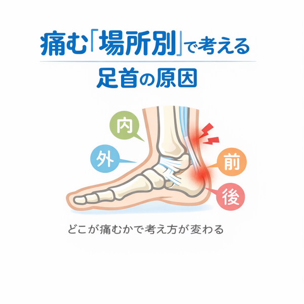 「内側がズーンとする」「外くるぶし周りが気になる」「前や後ろがつっぱる感じがある」など、感じ方は人それぞれ。ここでは、痛む場所ごとに考えられている原因を整理してみます。